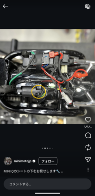 これはミニモト社公式インスタに上がっているブラック/レッド仕様のミニQのシート下にある電装系を写している画像ですが、イグニッションコイルの取付部分が、オーバートルクで締め付けられているせいか、はたまたコイル自体の問題なのか変形しています 苦笑